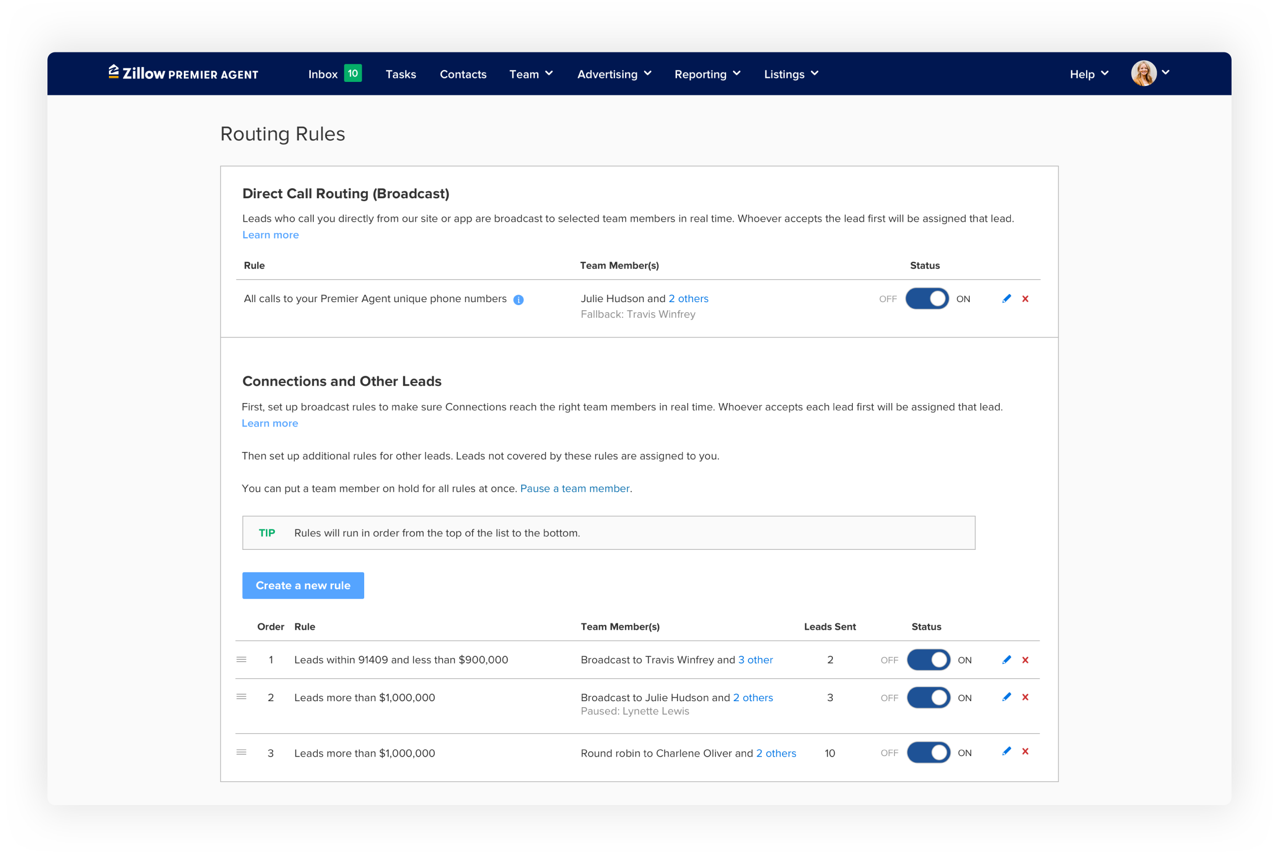 - Some team leaders send connections looking for homes in certain locations or price points to more experienced agents, while others use percentages to manage the lead mix. A common way to do this is routing a larger percentage of leads from lower-priced ZIP codes to new agents and sending a larger percentage of leads from higher-priced locations to more experienced agents. This ensures similar lead volume but a mix that is customized to an agent’s skill set.