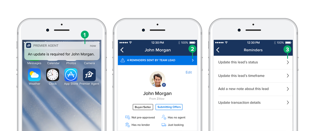 When a reminder is overdue, team members get a nudge to update lead status, time frame or add notes via push notifications on their phone. In order to receive these notifications, team members must have the Zillow Premier Agent app. Push notifications are sent every 24 hours when a task is overdue — both as an immediate push notification that lets team members know which lead requires an update, and as a summary notification that lets team members know how many contacts have reminders that are overdue.