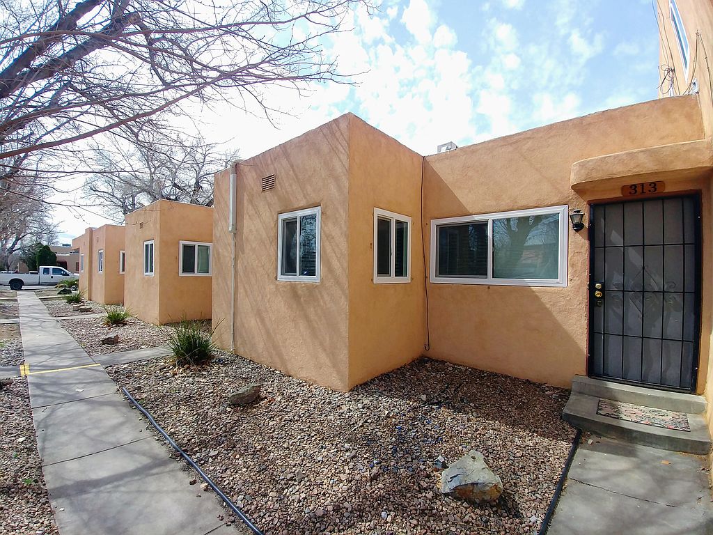 Smartly updated downtown 1 bedroom charmer. Enjoy the best modern comforts and upgrades combined with caring preservation of the property's vintage character. Hardwood floors, restored mid-century modern / art-deco built-ins and finishes. All the original coves, nooks, arches, and custom touches are complimented by a state of the art mini-split heating and cooling system and energy efficient thermal windows. Pragmatic original floor plan offers built-in shelves, cupboards, and drawers in the hall with a separate built-in work desk. Large eat-in kitchen features a full-sized gas range and the sweetest original cabinets and custom tile work with access to a private backyard space with a large, private patio (no maintenance!). Updated, community common area provides a laundry room, a secure private storage unit assigned to the apartment, and secured bike storage. Located in one of Albuquerque's best downtown ABQ's best neighborhoods with exceptional walk / bike scores and easy access to excellent public transit. Close but not too close to the Rio Grande Bosque, Old Town, the ABQ Biopark. Photos are of a similar unit in the same building.