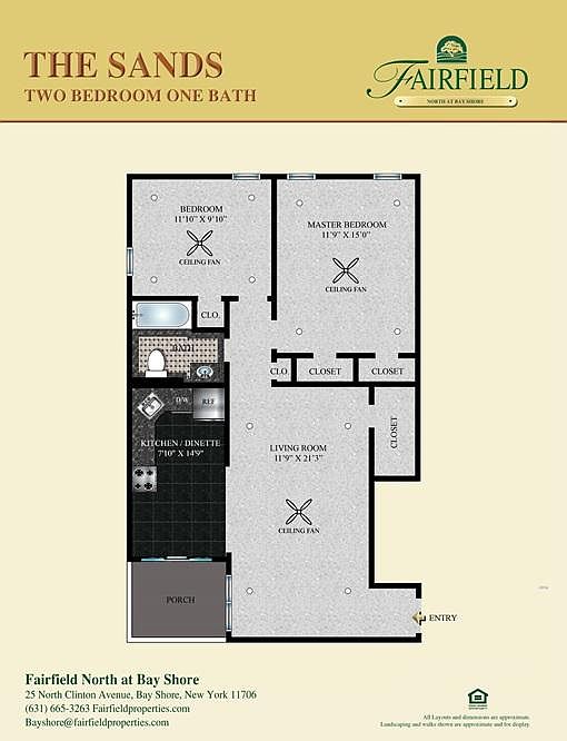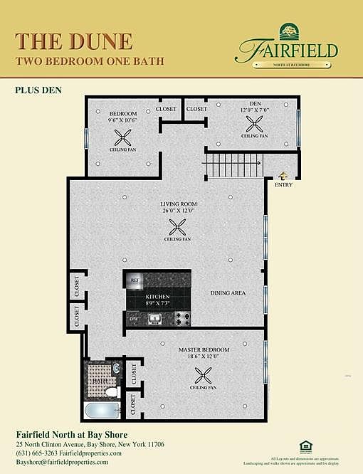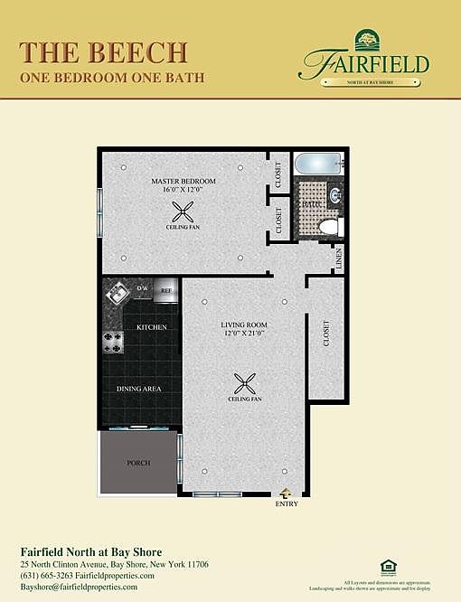 Fairfield North At Bay Shore near Bay Shore Village Main Street and Fire Island beaches, near LIRR. One and two bedroom rental residences feature private entrance, granite countertops, stainless steel appliances, carpeting or vinyl plank tile, hi-hat lighting, air conditioner, ceiling fans, two-tone paint, woodgrain style window treatments. Select residences include a sliding glass doors to large outdoor terrace, some feature a den.