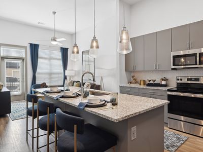 Sleek black kitchen appliancesBrand-new kent moore cabinetsFresh countertops