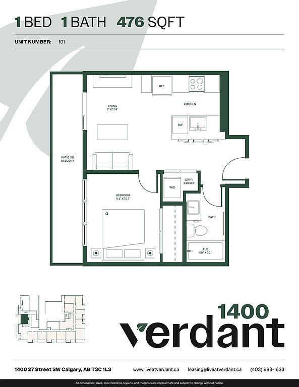 Welcome to Verdant at Bow Trail! Located in Shaganappi at 1400 27th Street SW, Calgary. Our pet-friendly building has all the best amenities including a lounge, fitness centre, rooftop terrace with BBQ, bicycle storage, car wash and pet spa! The apartments include high-end finishes, A/C, in-suite laundry and more! All with easy access to public transit just steps away from the Shaganappi c-train station, a quick commute to downtown, and shopping nearby that includes Westbrook Mall and 17th Ave SW.