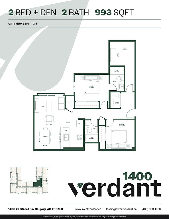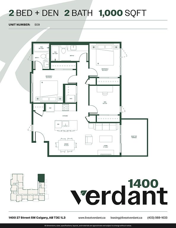 - 2 Bed + Den/2 Bath $2576-$2845 for 990-1054 sqft
