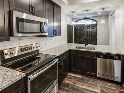 Ground floor unitModern paint schemeStainless appliancesOpen conceptMature landscapeFull car garageOutdoor parking spot