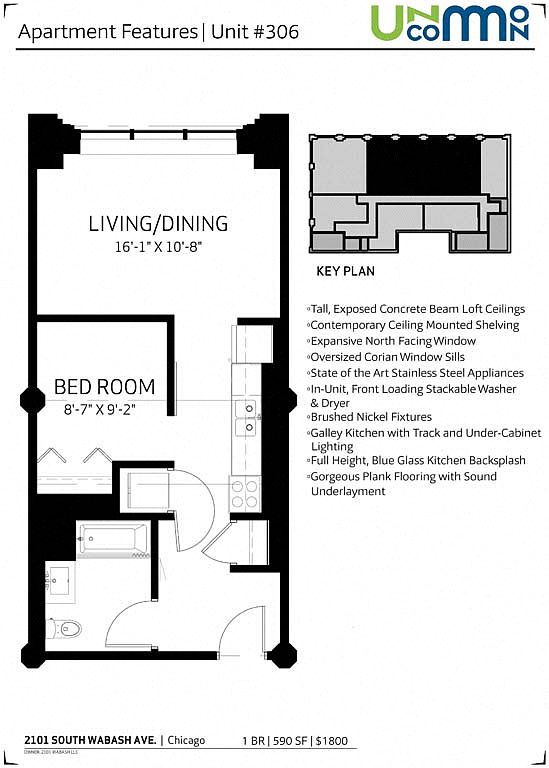 Discover Uncommon Apartments in the South Loop, a boutique apartment building offering 43 unique loft-style floor plans situated at the corner of 21st Street and Wabash Ave. Across the street from the Cermak-McCormick Green Line Train Station and Bus Stop, our prime location grants easy access to downtown and Museum Campus, while local amenities like restaurants, bars, banks, and shops are just steps away. Embrace urban living with our on-site fitness center, package room, and bike storage center. Inside, each unit boasts expansive windows, custom floating kitchen shelving, full-size in-unit laundry, and stainless steel appliances, ensuring modern comfort and convenience.
