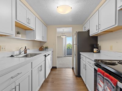 Modern Kitchen: The kitchen is well-appointed with essential cabinetry and workspace, making meal preparation a breeze. Enjoy the convenience of modern fixtures and ample storage space.