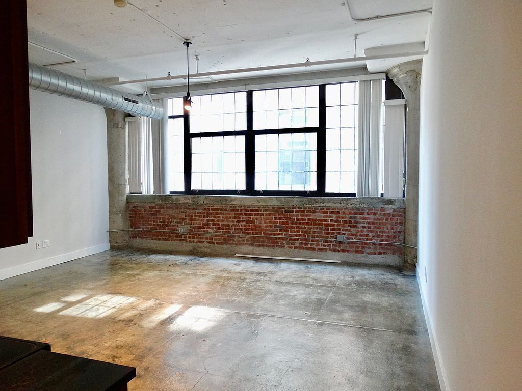 Oversized double pane windowsDowntown viewsExposed brickRaw contemporary styleVintage buildings