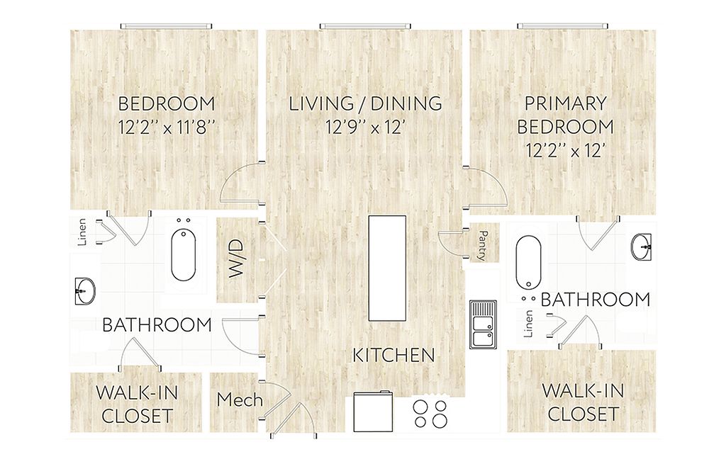 In-unit washer and dryerOpen floor planSleek stainless steel appliancesLarge windowsGranite countertopsHigh ceilingsLuxury wood-style flooring