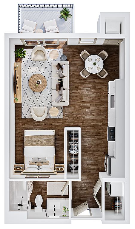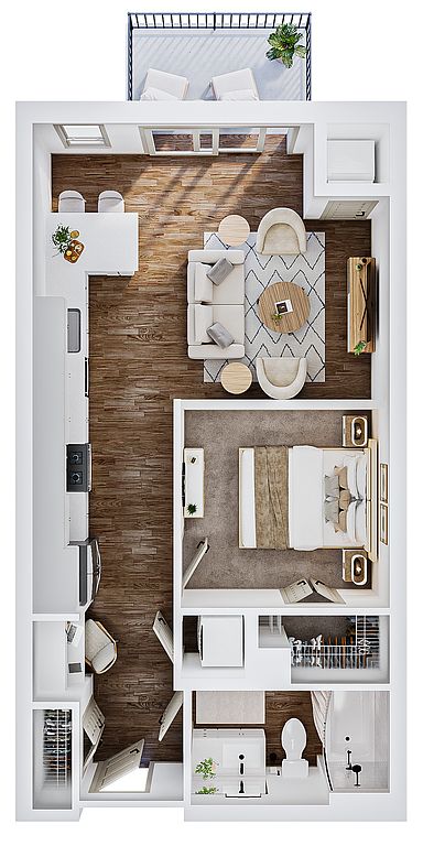 Enjoy resort-style amenities including a courtyard pool, sauna and spa, state-of-the-art fitness center, co-working suites, private movie theater, golf simulator, and a rooftop Sky Lounge with stunning views.