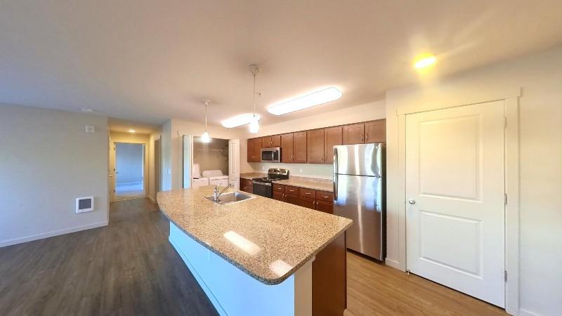 Rock Creek Ridge Apartments offers newly constructed, luxury apartment homes located next to the Fred Meyer Shopping Plaza. After a long day at work, it's great to unwind in the 24-hour fitness center, swim a few laps in the seasonal pool, or take a relaxing soak in the year-round spa. Easy access to schools, highways, and public transit. The community features a clubhouse with wi-fi, package receiving service, walking path surrounded by green space, covered parking and is entirely non-smoking. Choose from a selection of three different floor plans in which pleasing neutral colors complement a range of decorating tastes, and private patios or decks put you in touch with the beauty of your surroundings. Each apartment home has an open great room floor plan perfect for entertaining guests, luxury vinyl plank flooring in the great room, kitchen, hallways, and bathrooms, carpeted bedrooms with large closets, and full-sized washers and dryers in each home. Other features include energy efficient lighting, stainless steel appliances, and quartz countertops throughout. Drive by, stop in, or call today. We offer a model apartment home to help you envision your new home at Rock Creek Ridge apartments.