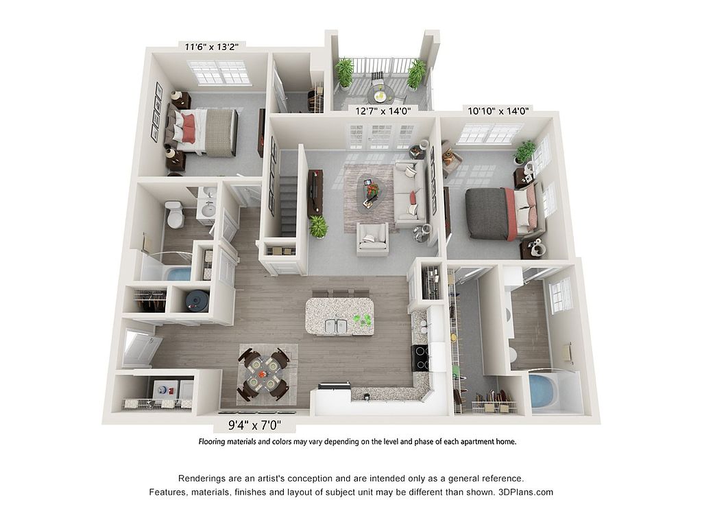 State-of-the-art kitchenFull-size washer and dryerGranite countertopsIsland and breakfast barPrivate balconyCeiling fans