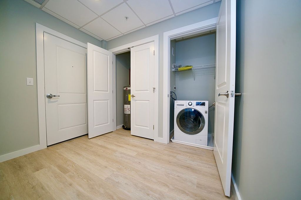 Stainless steel dishwasherWashing machine and dryerExposed duct workExposed white washed brickGranite counter topsStainless steel appliances