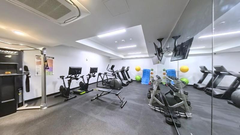 *On-site gym with exercise bikes, treadmills, dumbbells, bench, and mats