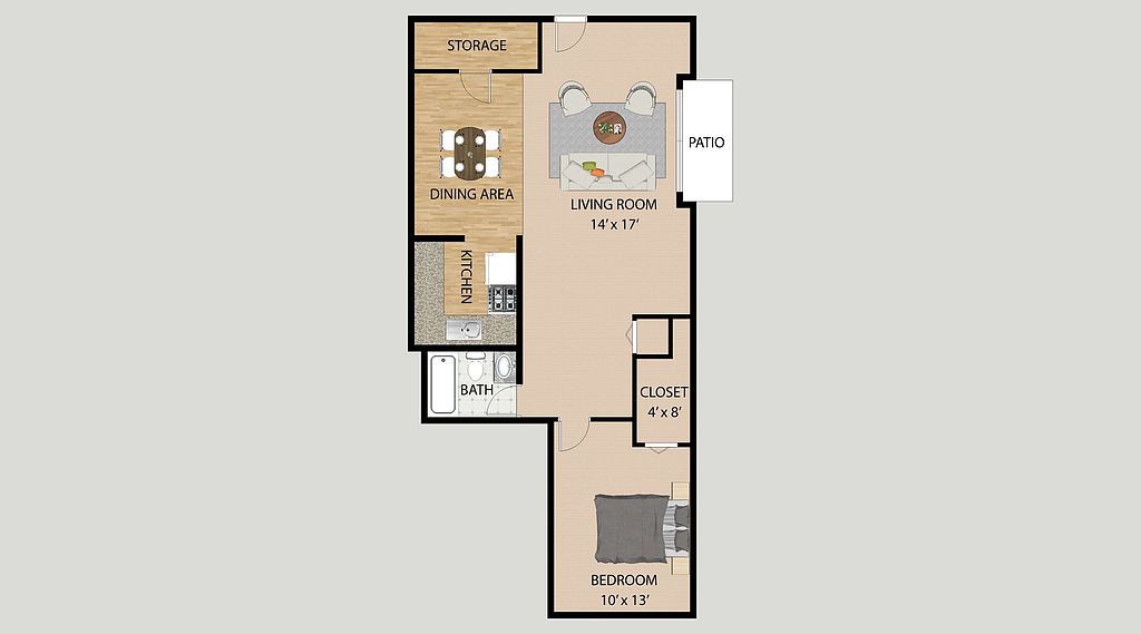 Efficient storage solutionsCompact spacePlenty of storageModern fixturesCompact dining nookCozy one-bedroomPark-like setting