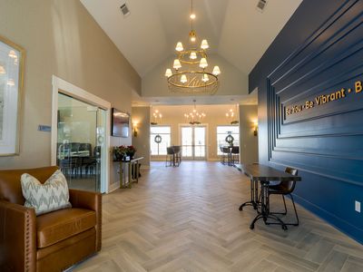 Slate flooringTall windowsHigh ceilingsWasher dryerSpacious one bedroom loftWhite cabinetsHardwood floors