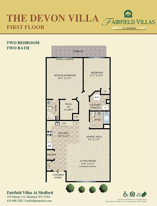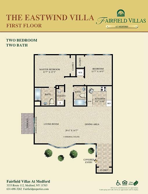 Fairfield Villas At Medford: Ranch and Villa Style community. Nature trail. Clubhouse. Outdoor Pool. Electronic access gate. Spacious apartments. Washer and dryer. Central Air. Terrace. Clubhouse. Lounge. Fitness Center. Pool. Playground. Convenient to Route 112, Route 83, Long Island Expressway exit 64. Near Lowe's, Target. Restaurants.