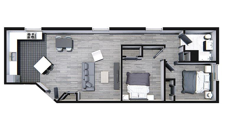 Stainless steel appliances, quartz countertops, and shaker-style cabinetry. Spa-inspired bathrooms and contemporary tilework. Residents enjoy amenities such as a state-of-the-art fitness center, a tenant lounge with billiards and a gaming room, and on-site laundry facilities.