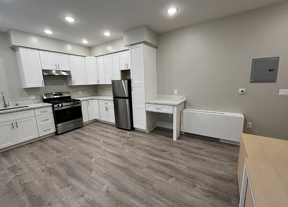 Stainless steel sinkPlenty of cabinetryLarge windowsLaminate plank flooringSolid surface countersUpgraded kitchensCompletely remodeled studio apartment