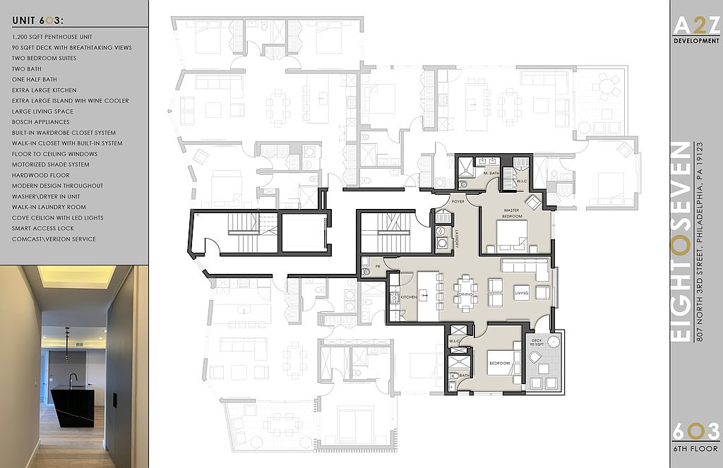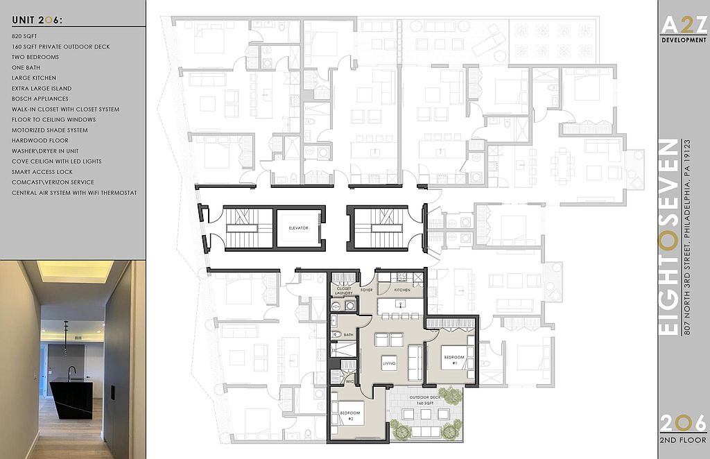 807 N 3rd Street is a newly built 32 unit apartment building unlike any other in the heart of Philadelphia's best neighborhood. The buildings design and amenities separate it from other similar sized buildings, the 807 experience is simply better. The building has a gym, roof deck, meeting/study room, lounge with big screen TV and pool table, parking, and dog washing station. The apartments are all unique layouts and each offer their own special features.