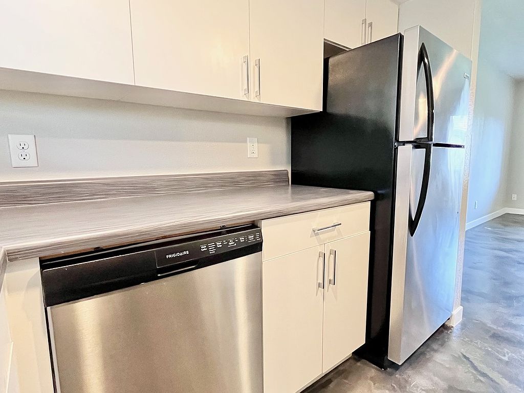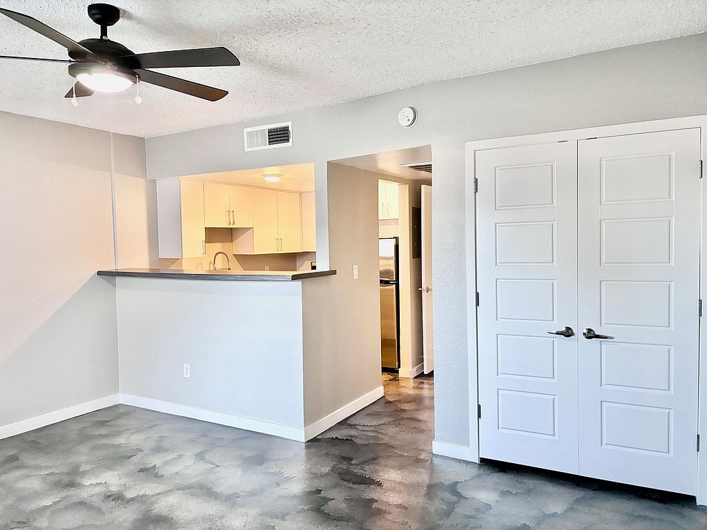 Discover the modern comfort of our renovated interiors, featuring stainless steel appliances, practical epoxy concrete flooring, in-suite washer-dryer units, contemporary countertops, spacious closets, ceiling fans throughout, and updated kitchen cabinets and baths.