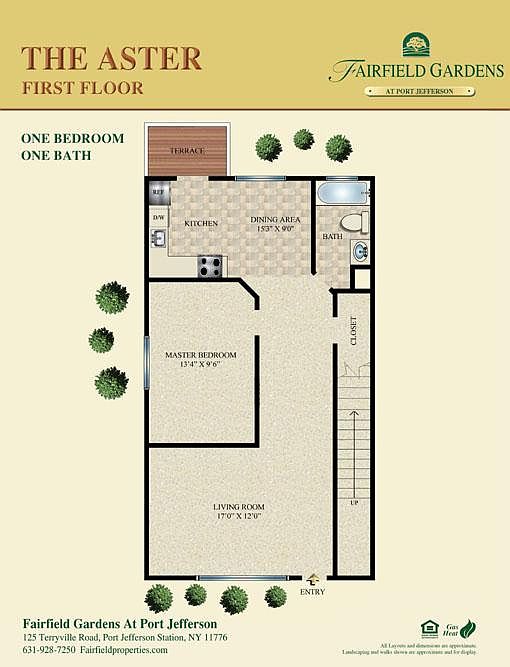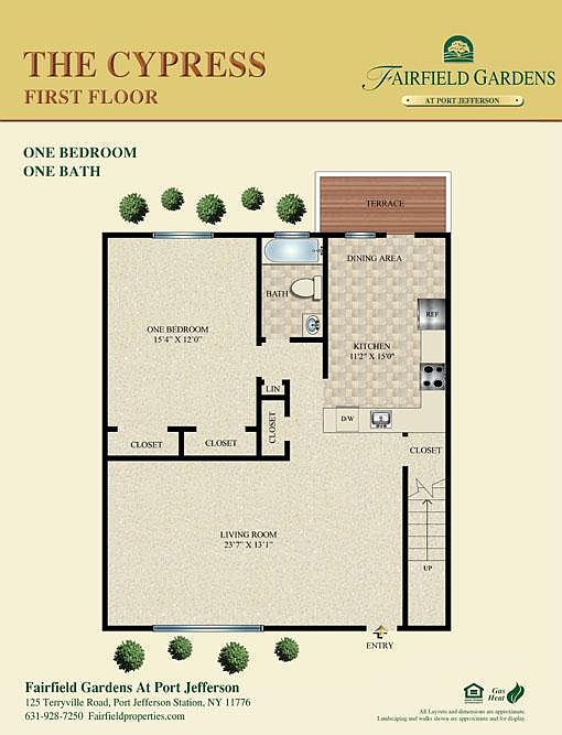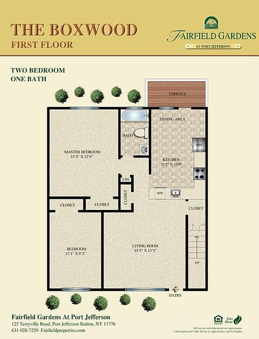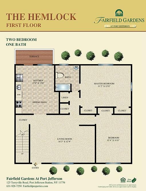 Fairfield Gardens At Port Jefferson location is convenient to Port Jefferson harbor and historic village, SUNY Stonybrook, St. Charles, John T. Mather hospitals. Near Long Island Railroad. Heat and hot water included.