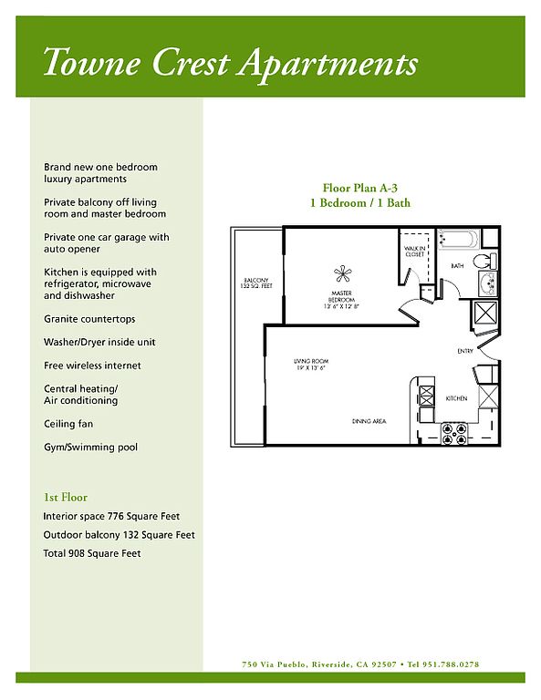 All our apartment rentals INCLUDE: Custom GRANITE Counter-tops, PRIVATE Balconies, WASHER-DRYER inside unit, a PRIVATE ONE CAR GARAGE with Auto Opener!, REFRIGERATOR and MICROWAVE, Central Heating-Air, Swimming POOL and GYM, GATED COMMUNITY, and is located next to a UCR Highlander Shuttle Stop and various Restaurants, Stores, Banks, etc.