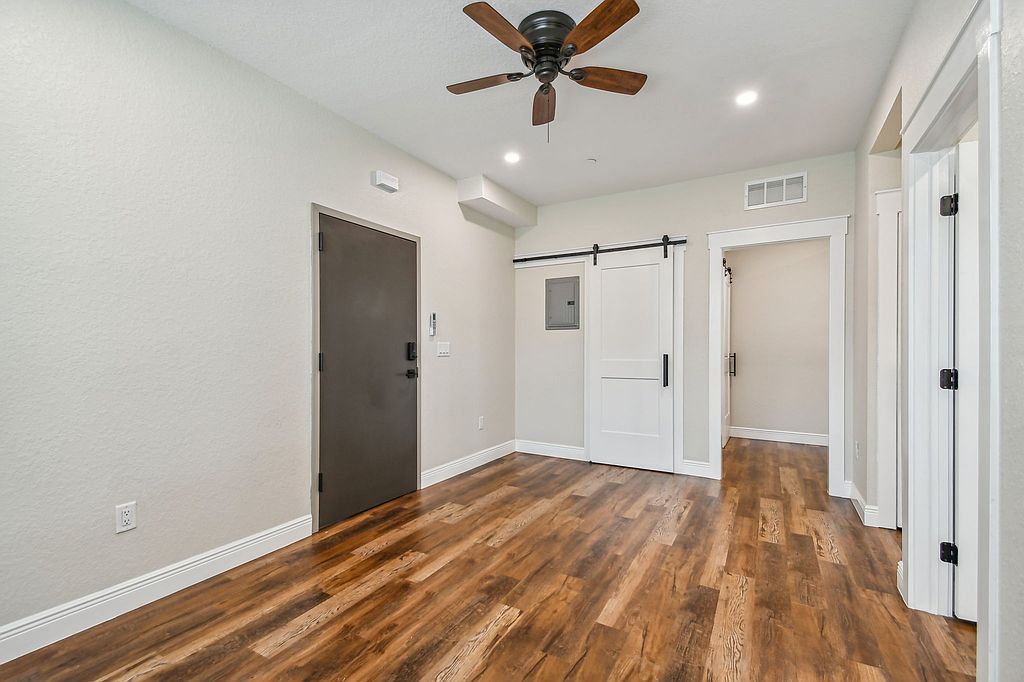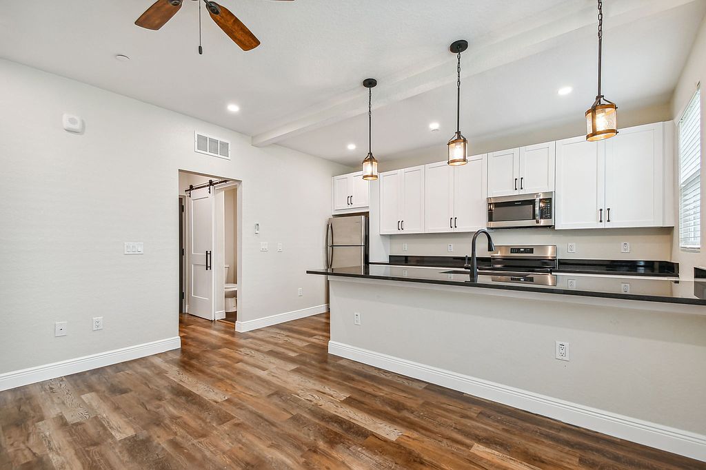 Quartz countertopsBarn doorsStainless-steel appliancesCeiling fansHigh-end finishesHardwood floors