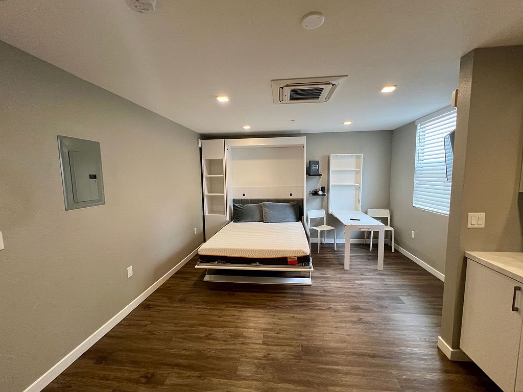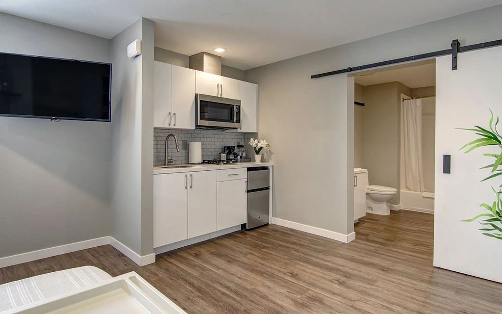 Each living space at Studios435 is furnished with a queen-size European pull-down bed, full-size bathroom, large closets, quartz countertops, tiled kitchen backsplash, European kitchen cabinetry, stainless steel appliances, and more.