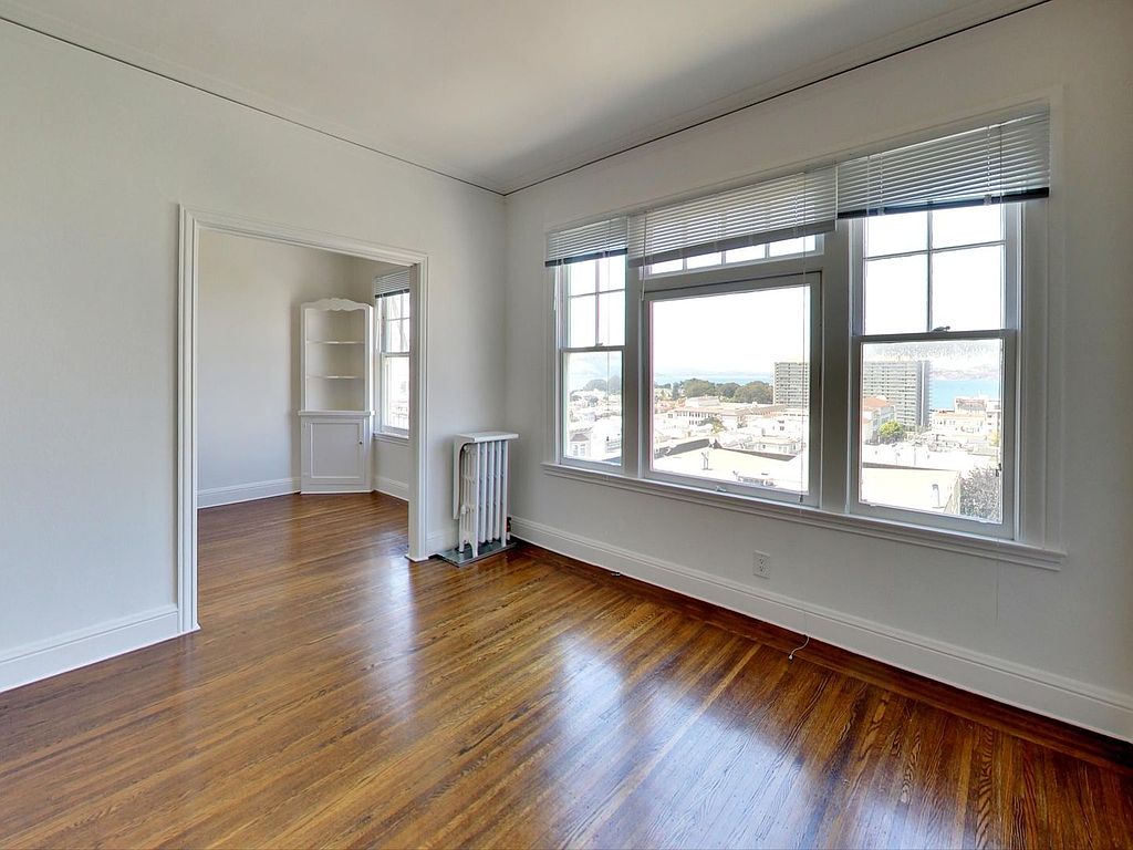 A large, beautiful Russian Hill studio apartment with lots of closet space is available now! The apartment features hardwood flooring throughout and plenty of natural sunlight. The main living space offers views looking out toward Alcatraz and the bay through its' large windows. You'll also find not one, but TWO large closets that offers plenty of storage. The foyer separates the unit's bathroom from the main living space and in the bathroom, you'll find lightly colored tiling that keeps the room feeling light and clean. The white kitchen makes the room feel a bit larger and offers a gas range stove and refrigerator. Attached to the kitchen is a dining nook that is partially separated from the main living space. There's a lot to love about this charming apartment - come see for yourself!