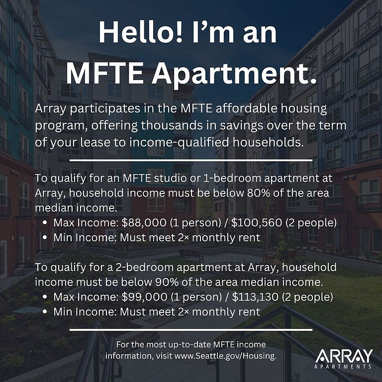 - Special offer! UP TO 6 WEEKS FREE! - Apply to Array today to receive up to SIX WEEKS of FREE RENT! This offer is valid on select apartments for a limited time. Additional terms and restrictions apply; contact our office for details. Equal Housing Opportunity.