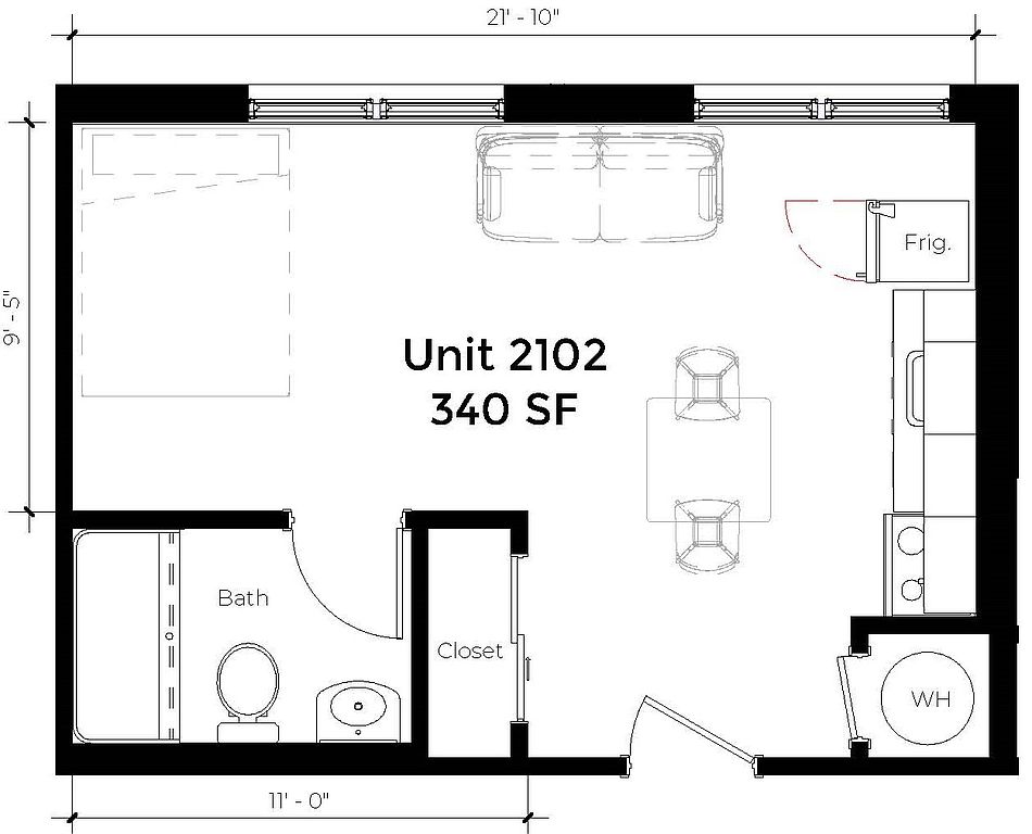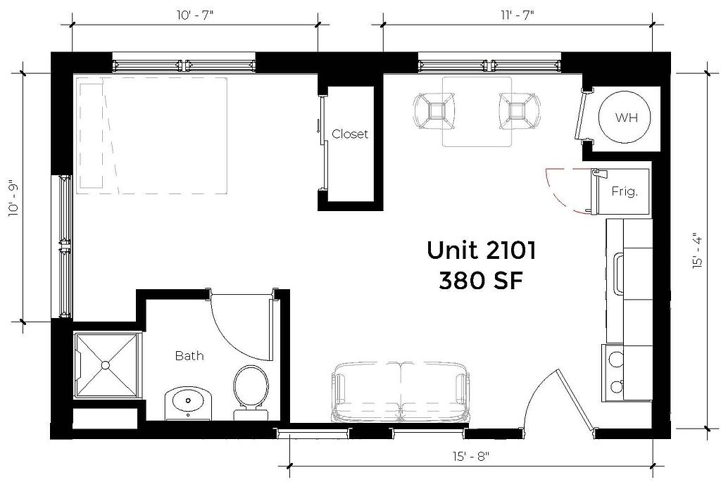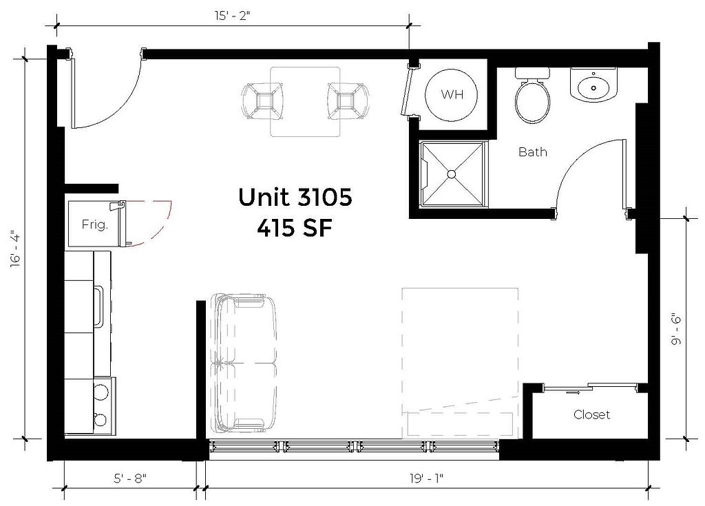All of our studios are all inclusive and have smart locks, individually controlled heating and cooling systems, stainless steel appliances, custom cabinets and quartz countertops. The sizes range from 249sqft to 520sqft.