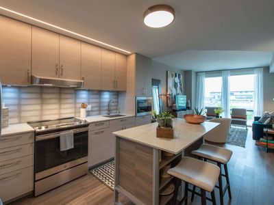 - Soft-close walnut cabinets, under cabinet LED lighting, and white quartz countertops with waterfall feature