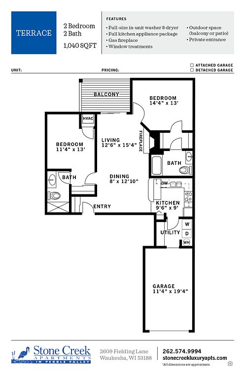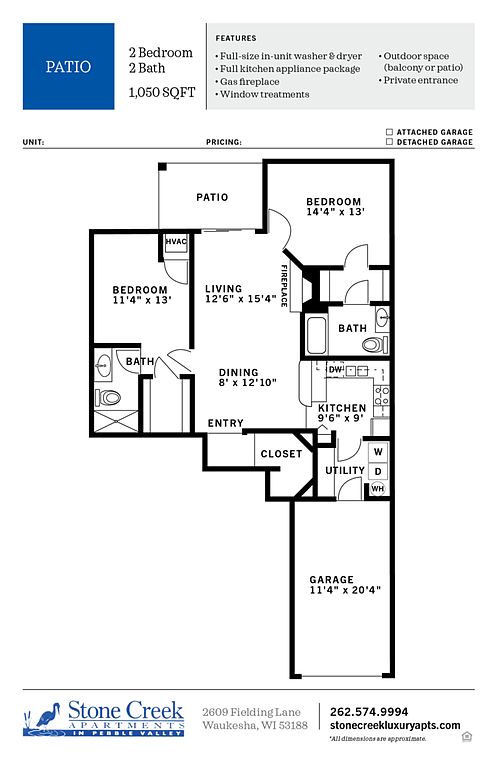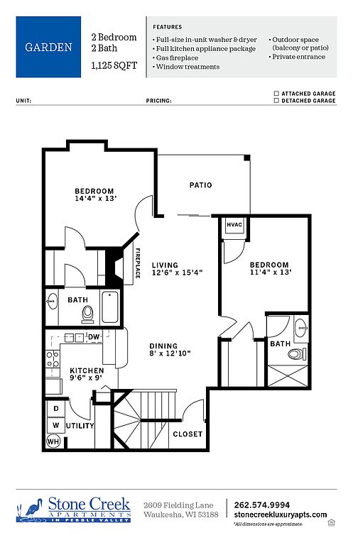 Welcome to Stone Creek Apartments - located in the Pebble Valley neighborhood of Waukesha. All of our two-bedroom two-bathroom apartment homes come complete with a full kitchen and microwave, gas fireplace, large patio or balcony, private entry, one-car garage, spacious walk in closets, and in-unit laundry with full size appliances. We believe that quality is in the details and we strive to bring you the highest quality apartment living experience through every little detail. You're going to love your future home at Stone Creek.