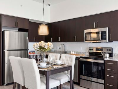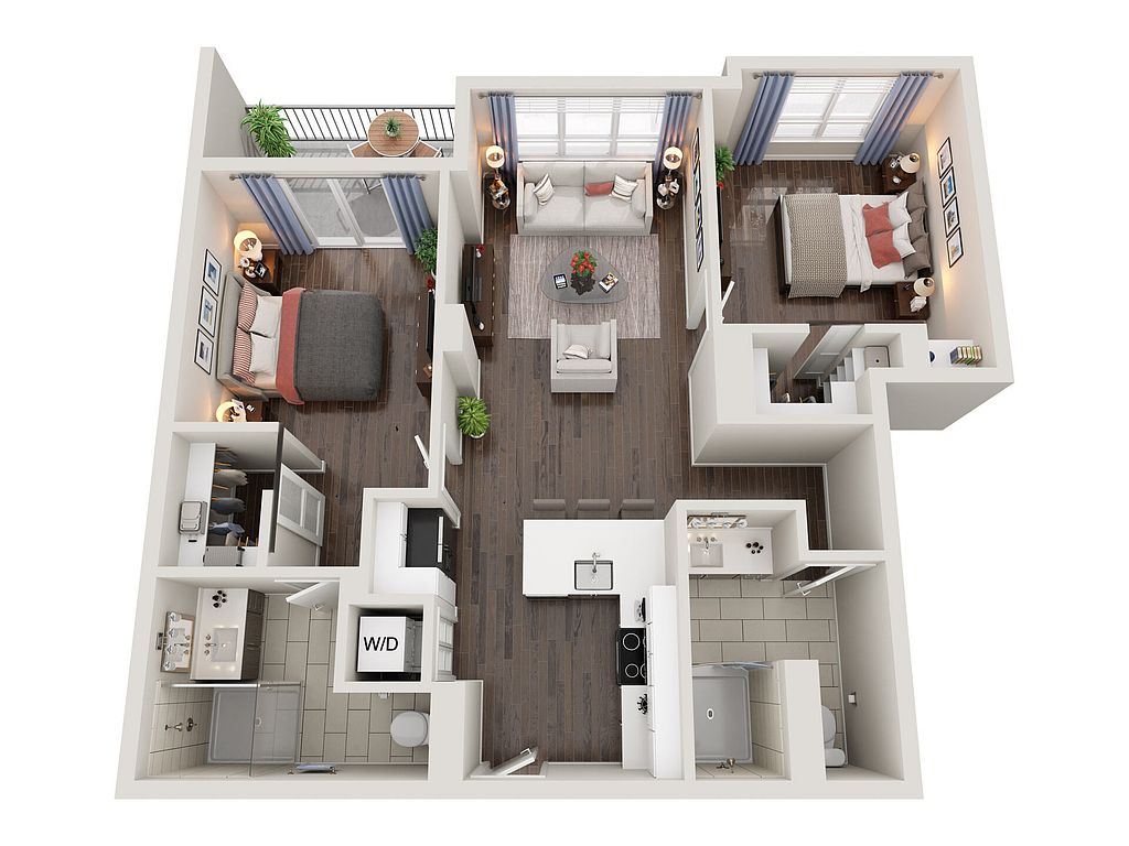 Quartz countertopsChic rooftop recreational deckUsb outletsStand-up showersBerber carpeting in bedroomsHardwood floors