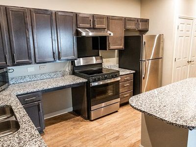 The bright and open living area is on the ground level, with a half bath for convenience. Both bedrooms and two bathrooms are located on the second floor. Special features of this home include LVP flooring throughout, quartz countertops, stainless steel appliances, and ceiling fans in the living room and all bedrooms. A washer and dryer are also included.