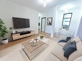 This charming 1-bedroom residence boasts a spacious living area, an open kitchen equipped with stainless steel appliances, including a dishwasher, and French doors leading to a queen-sized bedroom with a generous closet. You'll also find exposed brick accents and a beautifully renovated bathroom featuring a glass shower.