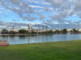 Welcome Home to this beautiful waterfront property situated on Dawn Lake in Sun City! Upon entry you are greeted with the breathtaking tranquil lake views from the Arizona room with atrium doors that open to the patio and lake. The kitchen is accented with Corian counters offering good work space, ample cabinets, and white appliances. Inside laundry, which is off the kitchen has washer, dryer and cabinets . The primary bedroom features an ensuite w/ step-in shower. The second bedroom includes a desk, printer and router. Carpets have been recently cleaned. This will be a great home away from home!