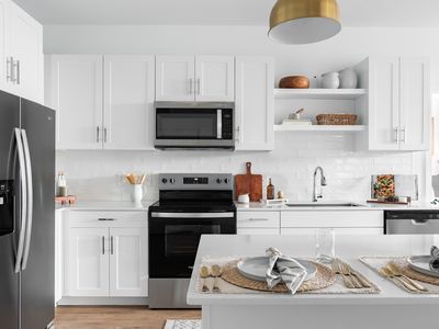 The kitchen is fully equipped with modern appliances including a microwave, oven, and dishwasher, as well as coffee essentials and a premium toaster. The bathrooms are private and stocked with essential toiletries and hairdryers. Enjoy entertainment on a massive 75" smart TV and new recreational amenities including a modern billiards table. Luxurious bedding includes premium mattresses, pillows, linens, and sheets. The apartment also features smart locks, security systems, motion detectors, and smart thermostats for convenience and safety, as well as high-performance kitchen appliances including a sleek Samsung refrigerator and modern LG washer and dryers and premium stainless-steel cooking appliances from GE.