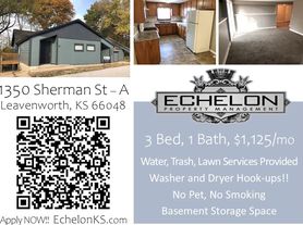 Central Leavenworth location, 3 Bed, 1 Bath Duplex on a residential street with no through-traffic!! Living Room opens to a private deck!! Kitchen includes Fridge, Oven/Range, and lots of counter space. Washer and Dryer hook-ups conveniently located on the main level!! Minutes away from Downtown Leavenworth, Fort Leavenworth, Lansing, and the Greater Kansas City Area!! No Pet, No Smoking. Water, Trash, Lawn Services PROVIDED!! No steps on the main level. Basement storage area!! Off Street Parking!!