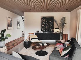Just beyond is a guest powder room, followed by the breathtaking grand kitchen with soaring double-height ceilings. This chef's dream space showcases smoked-oak cabinetry imported from Denmark, an AGA induction range, and radiant heat running beneath smooth concrete floors warmth and elegance in perfect balance. The space is perfect for entertaining, with plenty of space to host friends and family you can easily fit a large dining table right in the center for unforgettable gatherings. The kitchen opens directly to a private backyard with custom seating, ideal for al-fresco dining and entertaining.