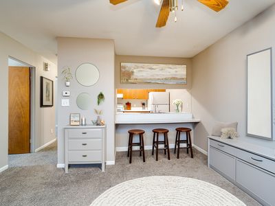 Modern bathroom fixturesFresh interior paintNew flooringNew kitchen countertopsElegant faux wood blinds