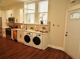 Natural light pours through the four oversized windows. The main room boasts a warm color pallet with luxury vinyl hardwood floors, recessed lighting, sizable closet, a beautiful kitchen with quartz countertops, 42" tall, white cabinetry with black accents, decorative backsplash, full size stainless steel appliances: fridge with french doors, double freezer, stove, microwave, front loader washer, dryer, air conditioner, and oversized ceiling fan. Four piece bathroom with black accents complements this studio apartment