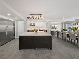 The open-concept living space has been redesigned with refined taste and craftsmanship: a chef's kitchen featuring Bertazzoni, Miele, and Liebherr appliances, sleek Poggenpohl cabinetry, and granite countertops flows into a spacious living room with custom walnut millwork and built-ins. The adjacent dining area offers generous space for entertaining.