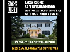 WEEKDay UPDATE , Wednesday ,4/1/2026 PROPERTY Is located SOUTH CHEEKTOWAGA (Zillow has GLITCH: NOT located in City of Buffalo). Clean, bright, large 3bd + 1.5 baths, with eat-in country kitchen, large 13 x 18+ft living room, and generously sized bedrooms. Full, separate private basement, laundry hookups, sink, lighting, extra power plugs & extra heating ducts in dry 8 ft basement. Use of 1/2 of 2 car-garage in fall/winter. Two concrete patios for outdoor dining. Use outdoor space for your own garden or use Weber propane grill, patio furniture, anytime, as if they were your own. Rent Includes newer stainless steel refridge with water and ice dispenser, dishwasher, direct-vented-to-the-outside microwave and NEW GE gas oven. Separate newer Central A/C. Very Energy-Efficient apartment, Andersen Windows, natural gas balanced billing is verifiable. You will live next door to me, Retired-Owner/Realtor of this custom-built duplex, which FEELS LIKE CONDO LIVING WITHOUT THOSE EXTRA FEES. Also if needed, WILLING TO EXTEND LEASE BEYOND ONE YEAR term! To lease, please participate in a credit check and Income Verification Process before touring. AFTER being qualified and income tested, your appointment will be arranged ASAP at your convenience. Sorry, no smoking/vaping, no firepits, or no pets. I respond very quickly. Hey, new luxury vinyl flooring is completed in kitchen + baths, as well as light-colored carpeting with new pad throughout. YOU can be the first to enjoy this updated space. You will love the quiet, safe, peaceful and natural setting at this address. The kitchen is large to feed a dozen people, I can verify that!