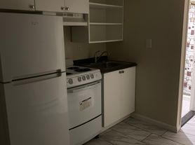 Spacious studio apartment with open plan, tile flooring, and white kitchen w/ stainless steel appliances. Quiet building with shared outdoor porch, in basement shared laundry. Tenant pays electric.