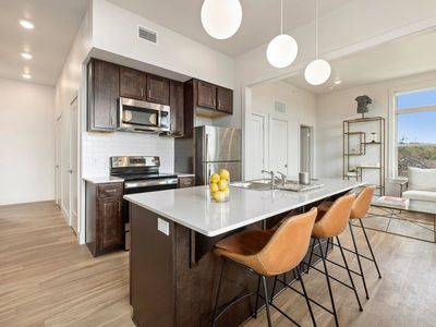 The home features a fully stocked kitchen with all amenities and appliances needed for staying in. Enjoy the outdoor living space with a Blackstone flattop grill and seating. For your convenience, there is a washer and dryer for guest use.