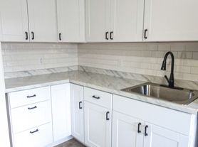 At the end of the hallway, the home opens into a spacious eat-in kitchen, which has been completely renovated. The kitchen features new shaker-style cabinetry, L-shaped quartz-style countertops, a deep stainless steel single-basin sink with matte black pull-down faucet, brand-new appliances (you will be the first to use them), and a subway tile backsplash for a clean, timeless finish. A bay-style window adds natural brightness and provides a comfortable space for a small dining table or morning coffee setup.