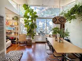 Wonderful, unique 2 bdrm. renovated classic Venice Beach cottage with large tree-shaded deck and separate studio/office/guest room combines the best of old-school Venice and mid-century modern. Private, secluded, serene, secure. Enter through covered front garden deck into light-filled open floor plan living/dining room adjoining totally updated kitchen with Viking stainless pro stove, Bosch dishwasher, microwave and new custom wood and polycarbonate cabinetry. Original refinished clear vertical grain fir floors with vintage oak storage drawers in kitchen and dining area. Beautiful skylit wood and cement bathroom with vintage pink 50's sink "floating" on safety glass panels and matching pink tub. Large set of storage drawers in bathroom and adjoining dressing area with lots of closet/storage space. Large private back patio deck with picnic table sheltered by Brazilian Pepper tree... And off side of deck is a separate studio/office/guest bedrm and a side yard with large covered space for workshop/surfboards/storage etc. LG Washer and dryer included. New on-demand Rinnai endless hot water heater. One block from Abbot Kinney shopping and restaurants and 3 blocks from Venice boardwalk..