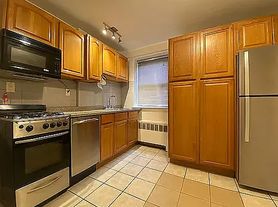 Eat in kitchenWood cabinetsHardwood flooringCeramic tiles