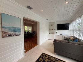 This perfectly located tropical beach house is stocked with everything you need to relax and get away from it all. The home is comfortable and spacious, and stocked with everything you need for your indoor and outdoor needs. The home is child-friendly and dog-friendly as well, offering all the beach gear essentials when you're ready to venture out. Inside, the home has a classic Florida room that receives lots of natural light and is comfortably outfitted with a couch and television. The kitchen and bathrooms have all been remodeled, bringing a modern element to the Old Florida charm. The dining area has room for eight along with two counter stools. The kitchen has all the essentials to make homemade meals together. Each of the two bedrooms have comfortable beds and plenty of space for personal belongings. Original hardwood flooring is found throughout the interior. The backyard features a heated lap pool that is open year-round, perfect for getting your laps in or just enjoying the peaceful scenery from the outdoor dining table.